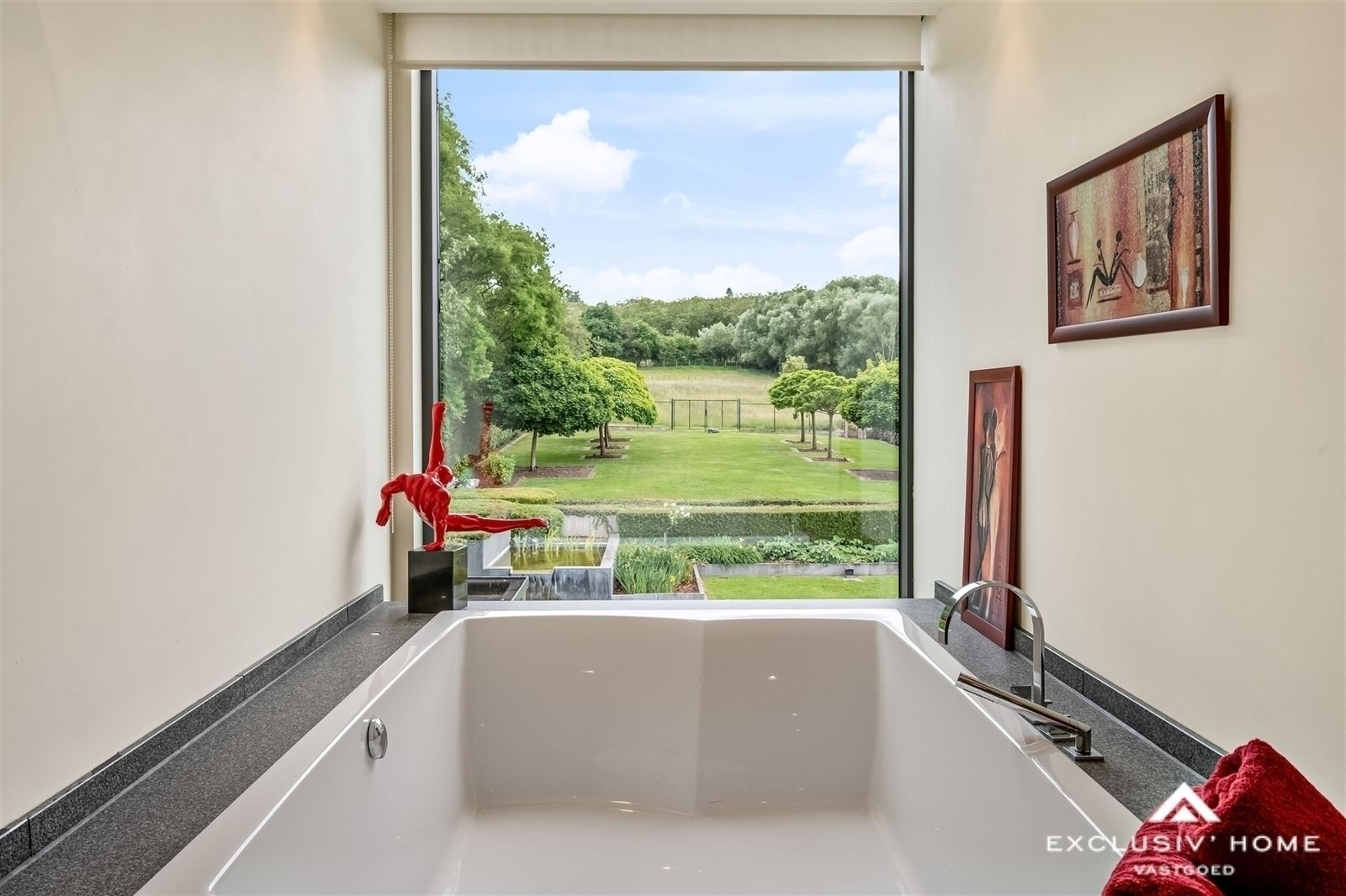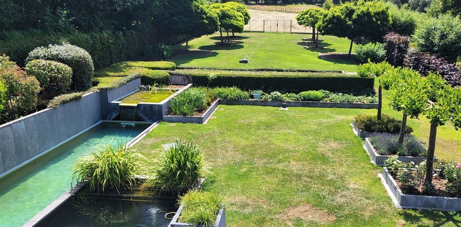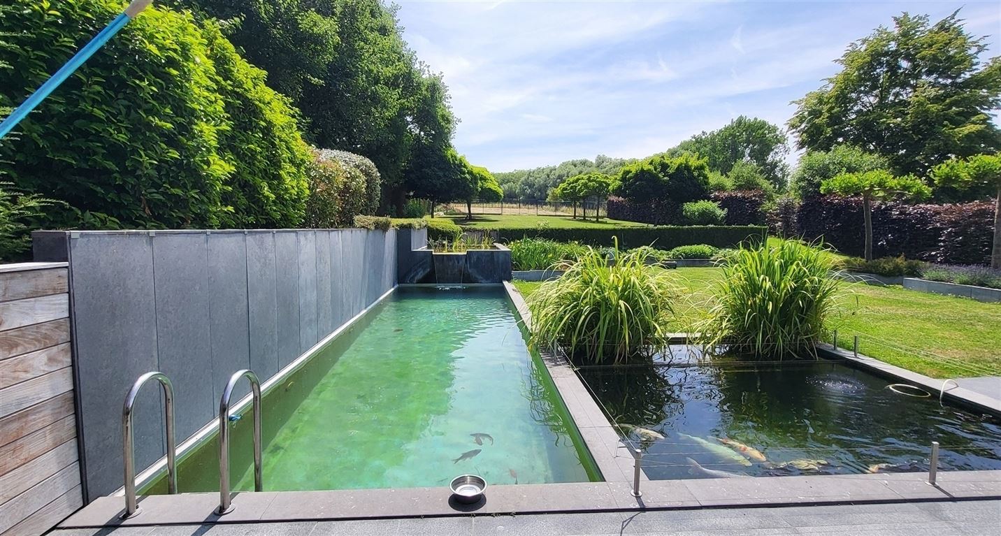 The beautifully landscaped garden with swimming and ornamental ponds, as well as (covered) terraces, invites peace and relaxation. The garden is fully enclosed with mature hedges and trees to ensure optimal privacy. The rear meadow of approximately 1.3 ha is perfectly suited for keeping animals.
