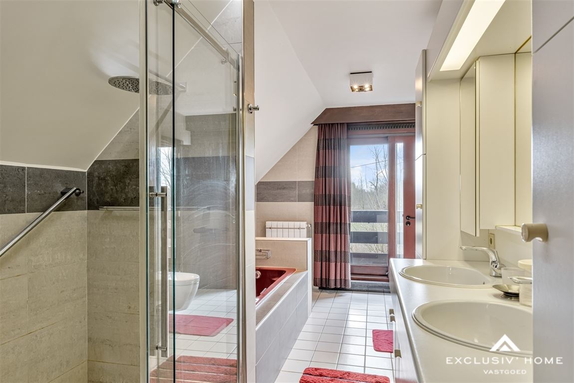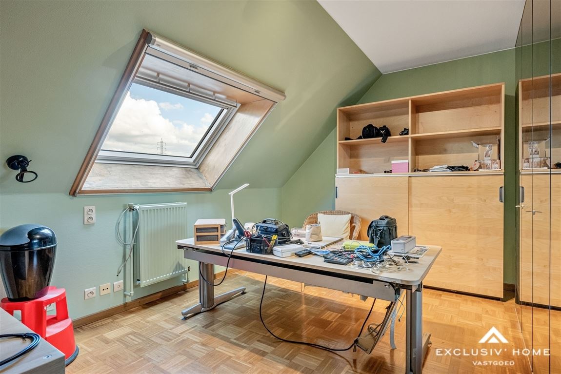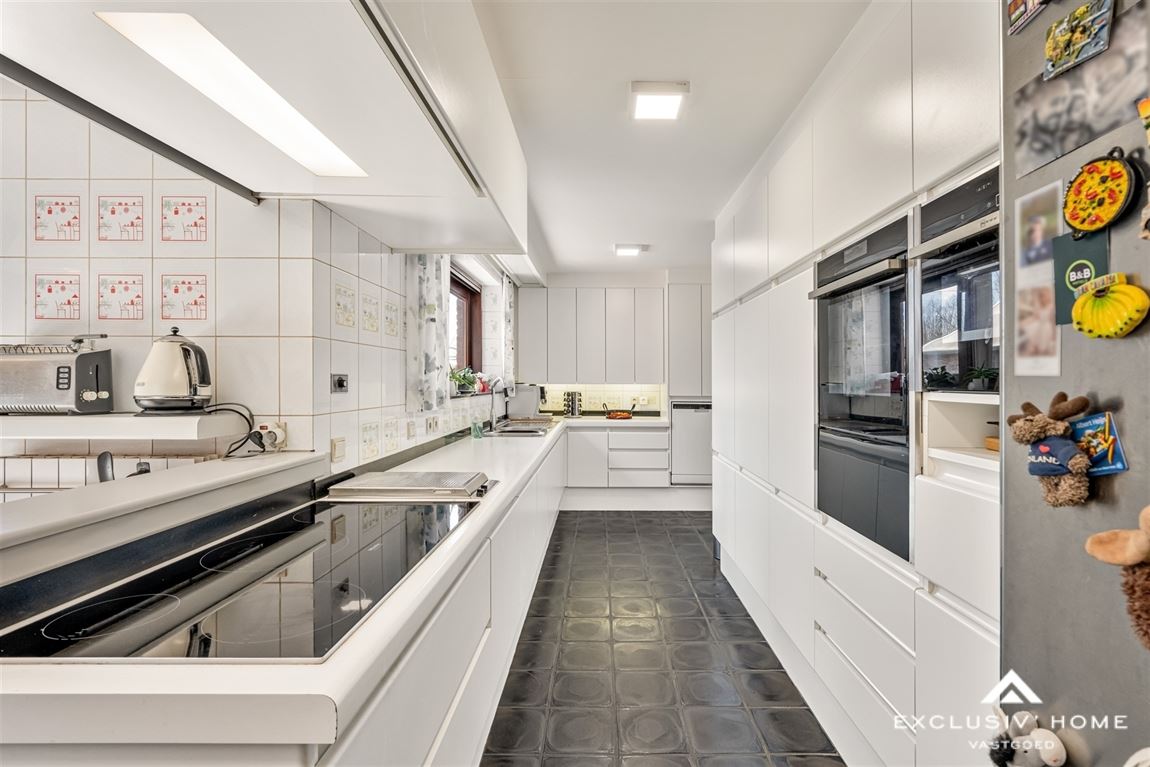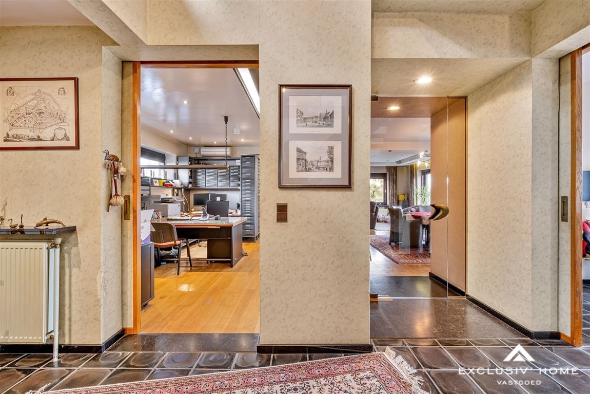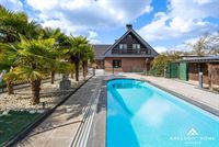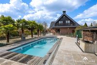 This timeless villa is located in a quiet cul-de-sac near the Dender, just outside the village center of Wieze – a charming town located between Aalst and Dendermonde. Peace and privacy are guaranteed thanks to the favorable positioning of the home and the enclosed rear garden. The property sits on a plot of 2,200 m², with a living area of over 300 m². The ground floor offers a spacious entrance hall with guest toilet and cloakroom area, a home office, a cosy living room with fireplace and dining area, a fully equipped kitchen and an integrated double garage. On the first floor, there are five spacious bedrooms, including two with a balcony and one with a private dressing room. The property has two bathrooms: one with a shower, and one with both a shower and a bathtub. One of the bathrooms is accessible from both the hallway and directly from a bedroom. The beautifully landscaped sun terrace with palm trees, the pool house with heated swimming pool, and the garden shed of no less than 80 m² invite you to relax in total privacy. The property is energy-efficient (EPC A – 84 kWh/m²), asbestos-safe, and has a compliant electrical installation. This villa is in immaculate condition and offers endless possibilities. Perfect as a family home for a large household, or even as a multigenerational (kangaroo) home. In short, a rare opportunity for anyone looking for a stylish, high-quality and move-in-ready villa in a peaceful, green setting.